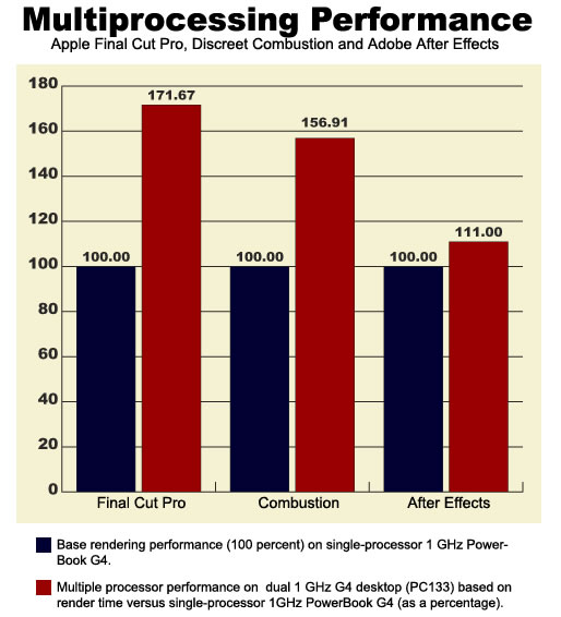 But why is it faster? Yes, gigaHertz do mean something. But what happens when you look not at comparisons between Intel- and Motorola-based systems but between single- and dual-processor Mac systems? Well, take a look at the following chart showing relative performance between three applications running on single- and dual-processor Mac systems.