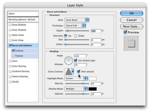 In all cases where layer styles were used, the basic style is Bevel & Emboss, with the Contour option checked. The "Size" of the bevel is reduced to 0. The gloss contour is often set to a profile other than the default profile. And, most important, the "Range" in the Contour settings is set to a very low number, ranging in these examples from 0 to 16. This allows the layer style to use the surface of the image, rather than just the edges of the layer, to create the emboss effect. Here's a sample of the settings used in the images below.