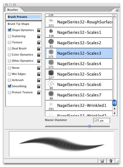 This new library of brushes for Adobe Photoshop--Nagel Series 32--offers 20 custom brushes designed to produce highly detailed human and animal surface textures. These include scales, bumpy surfaces, wrinkled surfaces and rough surfaces that can be used to simulate a wide variety of textures. All of the brushes in this collection (freely downloadable, as usual) are fully dynamic so that you can use your Wacom tablet to control things like angle, opacity, color, brush size, etc. They are also fully customizable, so you can create an endless variety and save them as your own unique brushes.