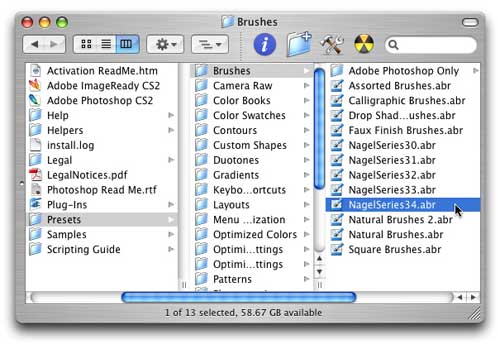 Once you download the brush file (NagelSeries34.zip), expand it. (The expanded file will be called NagelSeries34.abr.). Then move the .abr file into the Brushes directory in your Photoshop folder (/Adobe Photoshop/Presets/Brushes).