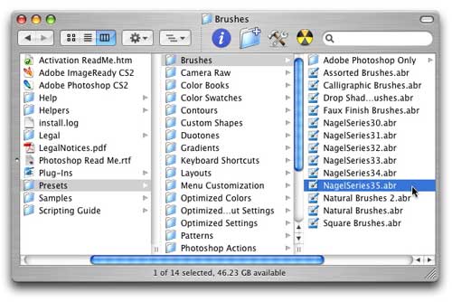 Once you download the brush file (NagelSeries35.zip), expand it. (The expanded file will be called NagelSeries35.abr.). Then move the .abr file into the Brushes directory in your Photoshop folder (/Adobe Photoshop/Presets/Brushes) to make it accessible from the Brushes palette's flyaway menu once you launch Photoshop.