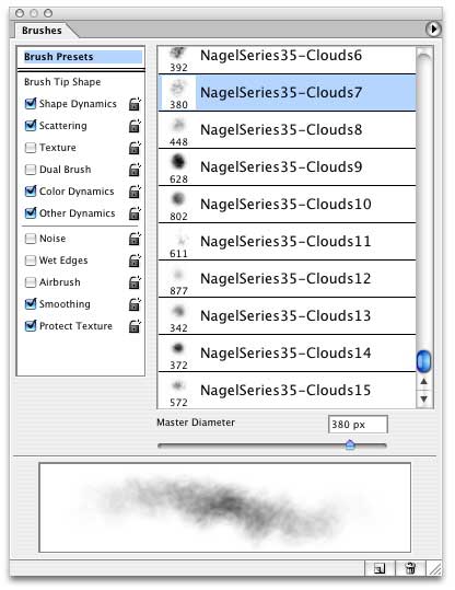 This new library of brushes for Adobe Photoshop--Nagel Series 35--offers custom brushes designed for creating clouds and similar effects, such as mist and haze, fog, smoke and the like. What distinguishes this latest collection from previous collections of cloud brushes that we've offered is shear size. The brushes in Nagel Series 35 range from a 333-pixel diameter at the small end all the way up to 877 pixels on the top end. So these are geared primarily toward working on larger images and images with high resolutions to provide a large amount of cloud cover quickly. However, you can also adjust the size of the brushes downward for working on smaller images.