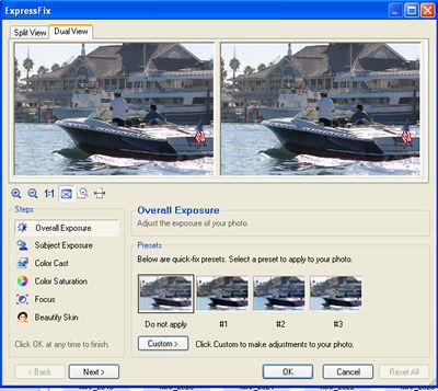 If any images needs to be tweaked, you can ExpressFix them. ExpressFix is a tool built into the application that enables you to perform some image editing tasks on your images without having to go into an image editing application. With ExpressFix, you can auto adjust the overall exposure, subject exposure, color cast, color saturation, focus and beautify skin. ExpressFix enables you to use presets or you can use custom to manually make adjustments to the images.