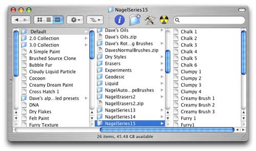 The collection is compressed in a .zip archive. Click the download link below, then expand the archive (NagelSeries1.zip), and you'll be left with a folder called NagelSeries15, which contains the 25 individual brushes.