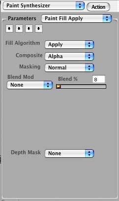 To do this, in the pull-down menu next to the Action button in the left-hand panel, select Paint Synthesizer. Then go to the Paint Fill Apply category. For the Composite parameter, choose "Alpha" from the pull-down menu. (There are many other composite modes available for you to choose from if Alpha doesn't work out for you.)