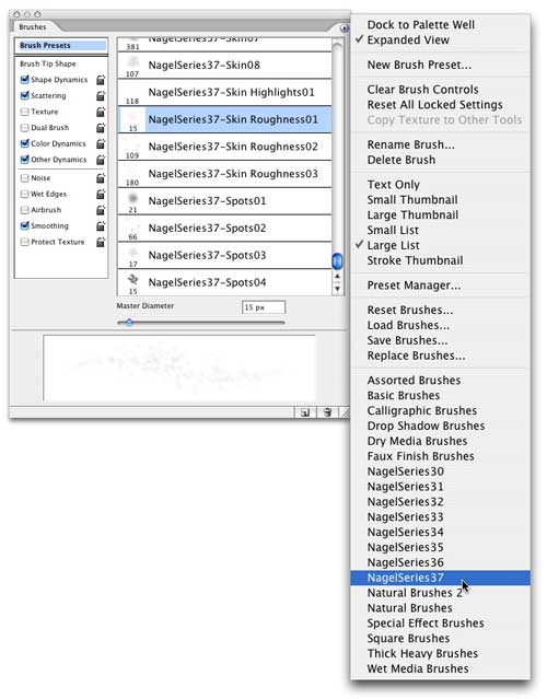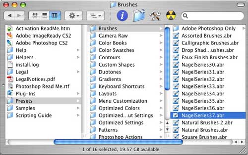 Once you download the brush file (NagelSeries37.zip), expand it. (The expanded file will be called NagelSeries37.abr.). Then move the .abr file into the Brushes directory in your Photoshop folder (/ Adobe Photoshop /Presets/Brushes) to make it accessible from the Brushes palette's flyaway menu once you launch Photoshop.