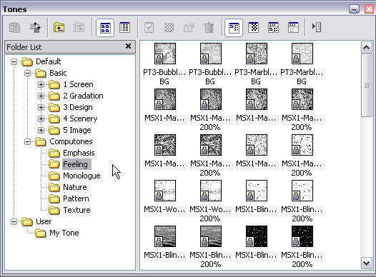 Not only are digital cross hatches used for tones, but you can import photographs to use as backgrounds, which Manga Studio EX will automatically convert to screen tones. If you don't have imagery to use as tones, not to worry. Debut ($50) ships with 1,800 different tones. Studio EX comes with more than 3,000 (and a separate disk of computones which has hundreds of additional tones). Of course, you can mix, match and create your own new tones, building a massive library of tones.