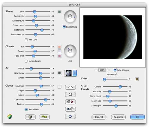 LunarCell 1.5 really couldn't be easier to use. You can begin with a preset planet, then modify its colors, atmospheric effects, sea level and the like with just a few simple slider adjustments. Or you can create completely random terrains with just a click of your mouse.