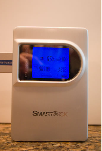 The SmartDisk Digital Photo Bank is very simple to use. There is virtually no set up, and it ships with a built-in, rechargeable lithium-ion battery, so there are no batteries to replace. You can use it in the field with the battery power, which takes up to four hours to fully recharge, and conversely you can also use it with the included power adapter. It features memory card slots for the most popular memory card formats, such as Compact Flash Type I and II, Microdrive, Secure Digital, multimedia card, Smart Media, memory Stick, and memory Stick Pro.