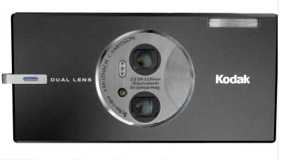The Kodak V570 digital camera is the first of its kind that sports dual lenses in the same unit. That is right, this point and shoot digital camera features a standard lens as well as a 5X (39-117mm) optical zoom lens. Two all glass, Schneider-Kreuznach C-Variogon lenses are incorporated into this slightly larger than business card-sized digital camera. It incorporates Kodak's new Retina dual lens technology to achieve the ultra wide angle (23mm equivalent) and 5X optical zoom range.