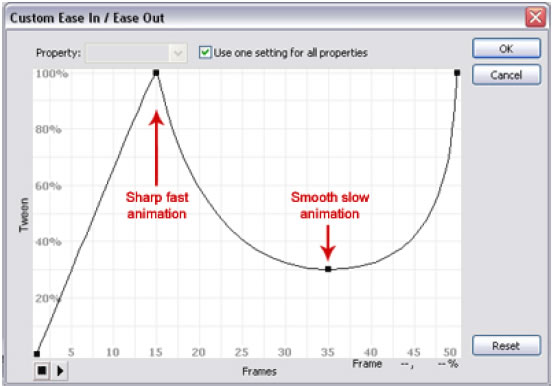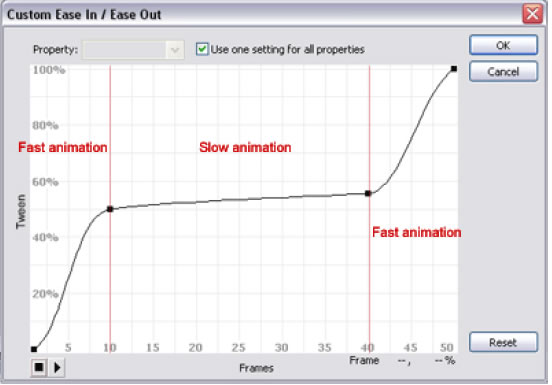 The Ease In/Ease Out graph is easy to use. The horizontal axis represents the frames of the movie and the vertical axis represents the percentage of change in animation (tweening). You control the animation using the control points on the velocity curve. You can add points by clicking on the curve or delete points by selecting the point and pressing the Delete key.