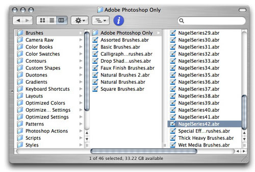 Once you download the file (NagelSeries42.zip), decompress it. It will then be called NagelSeries42.abr. Place the decompressed file into your Photoshop brushes directory, either at /Applications/Adobe Photoshop/Presets/Brushes/ or /Applications/Adobe Photoshop/Presets/Brushes/Adobe Photoshop Only/.