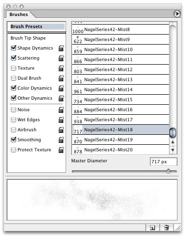 As usual, this week's collection of brushes are available free of charge for use in both commercial and non-commercial projects. But I am interested in how these brushes are being used, so please drop me a line at [email protected] with any information you can provide on how you're using them and where I might see examples. These brushes support Photoshop CS and CS2, though it should be noted that Photoshop CS2's paint engine has become extremely unstable when running under Mac OS X 10.4, so Photoshop CS is recommended until either Adobe or Apple can come up with a solution for this lingering problem. These brushes are also supported in recent releases of Adobe Photoshop Elements. The brushes run on Mac and WIndows systems, including Intel-based Mac systems running Photoshop under Rosetta.