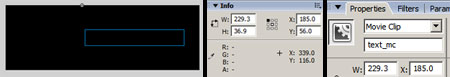 The last thing to do before we move on is to head back up to the main Timeline (click "Scene 1" in the Timeline window to get there), select the text layer, and drag an instance of the text_mc Movie Clip to the Stage. Make sure the registration point is sitting at the very top of the Stage and about a third of the way over (fig. 8, left), which translates to an x coordinate of 185 and a y coordinate of 56 when the symbol position grid is set to top left (fig. 8, center). The last thing to do here is to head for the Properties panel and assign this instance of the Symbol the highly inventive name of "text_mc" (fig. 8, right).