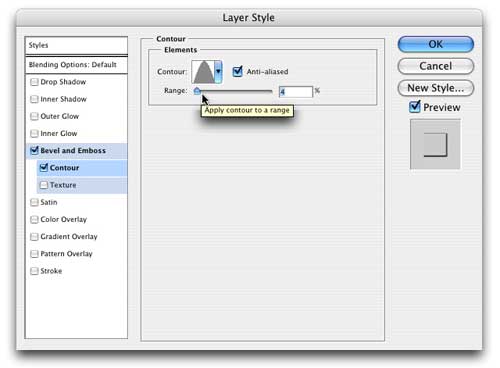 In all cases where layer styles were used, the basic style is Bevel & Emboss, with the Contour option checked. The "Size" of the bevel is reduced to 0. The gloss contour is often set to a profile other than the default profile. And, most important, the "Range" in the Contour settings is set to a very low number, ranging in these examples from 0 to 16. This allows the layer style to use the surface of the image, rather than just the edges of the layer, to create the emboss effect. Here's a sample of the settings used in the images below.