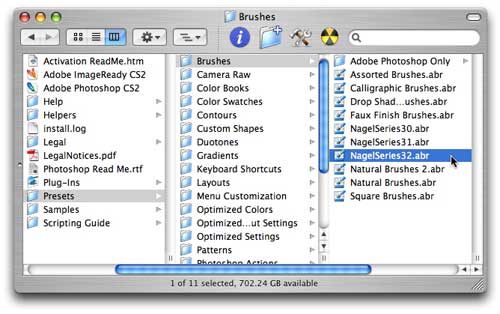 Once you download the brush file (NagelSeries32.zip), expand it. (The expanded file will be called NagelSeries32.abr.). Then move the .abr file into the Brushes directory in your Photoshop folder (/Adobe Photoshop/Presets/Brushes).