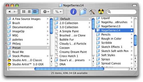 The unstuffed folder will be called "NagelSeries14." Place this folder in your Presets folder inside your Studio Artist 3.0 folder. It's best to place them within the "Default" folder (/Studio Artist 3.0/Preset/ Default), although you can also place them within other directories inside the Preset folder, if you wish.
