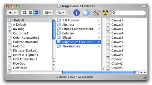 The unzipped folder will be called "NagelSeries1Textures." Place this folder in the following directory: /Applications/Studio Artist 3.0/TexSynth/Default.