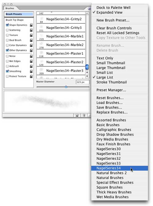 Then launch Photoshop. Open your Brushes palette, and click on the flyaway menu at the top right. There you'll find the new brush collection, which you can install simply by selecting it. After you select it, the new brushes will appear at the bottom of the list of available brushes. (Note that if the brushes do not appear in this flyaway menu, you can load them manually by selecting "Load Brushes" from the menu. A dialog will appear asking you to locate the brush file manually.)