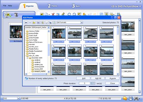 CD & DVD PictureShow 4 takes a tabbed approach to authoring a photo slideshow. There are three tabs that make up the workflow; Organize, Theme, and Burn. Your first step to creating a photo slideshow is to import the images that you want in the slideshow. This is achieved by clicking the photo icon with the + sign on it. After you've added the photos to the slideshow, you have some options.