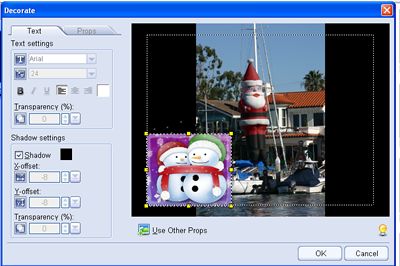 Once the images are done, you can click next and ExpressFix closes. In addition to tweaking your images, you can also Decorate the images with props, such as the supplied clip art, as well as text, enabling you to add titles or descriptions to the individual images in the slideshow. You can also rotate the images that need to be in an upright position, and give each image a description.
