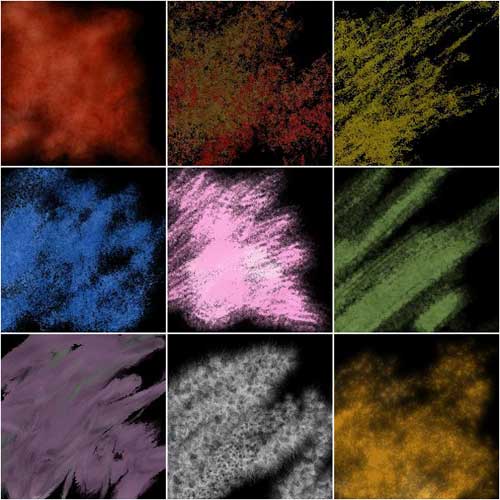 These brushes are, in order from left to right, top to bottom: Soft Brush 1, Clumpy 1, Clumpy 2, Grainy 2, Chalk 1, Chalk 6, Creamy 1, Furry 1 and Lumpy 1.