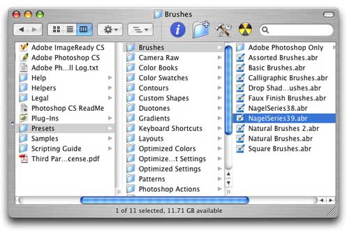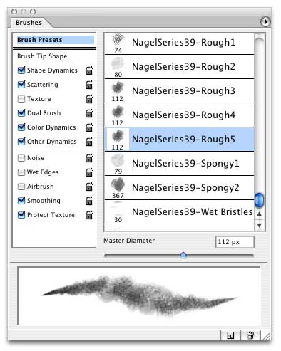 Once you download the brush file (NagelSeries39.zip), expand it. (The expanded file will be called NagelSeries39.abr.). Then move the .abr file into the Brushes directory in your Photoshop folder (/ Adobe Photoshop /Presets/Brushes) to make it accessible from the Brushes palette's flyaway menu once you launch Photoshop.