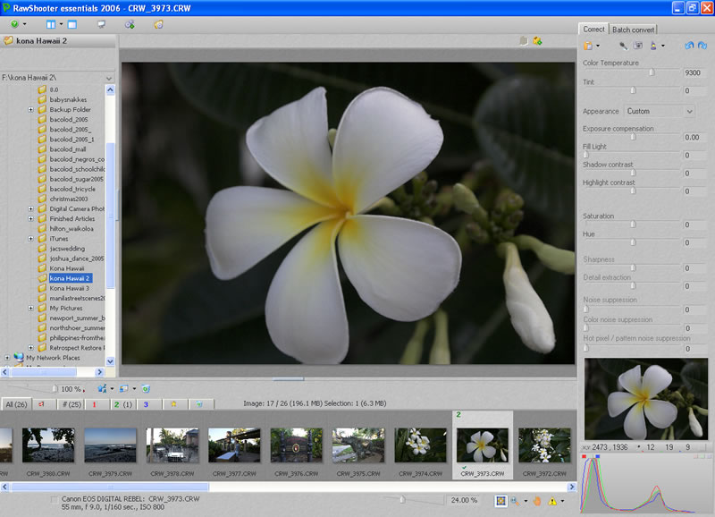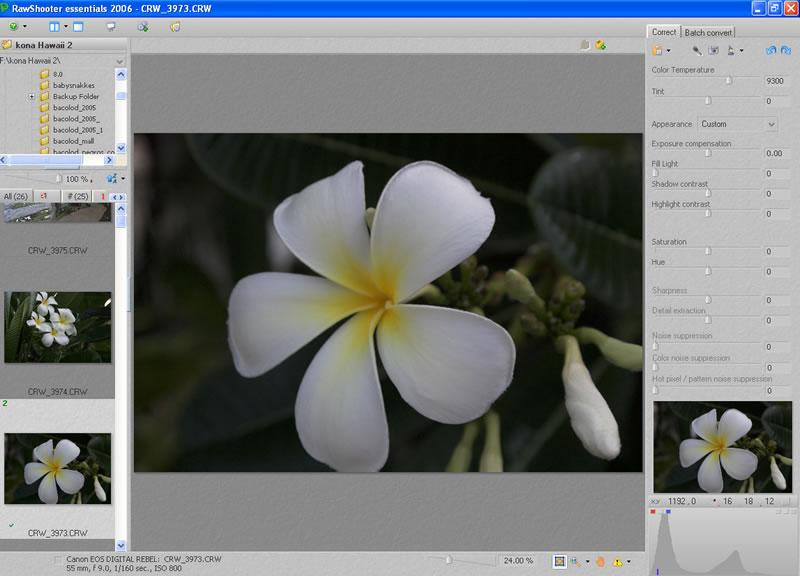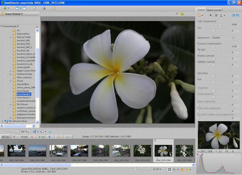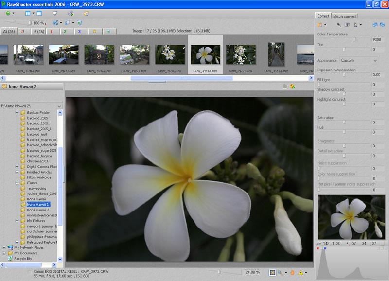 The interface of RawShooter Essentials features a file browser window, where you search for your Raw image files, a visual filmstrip of those raw files, and the preview window. The Correct and batch Convert tabs are where you do the great majority of your Raw file conversion.