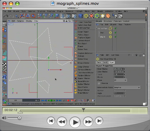 While there are several tutorials on the Mograph installation CD which begins shipping this week, I thought that I would produce a small project file with a few of the tools that you can easily reproduce.This week I've made a small movie examining the Mograph spline mask. This is a subtle tool with great utility to the motion graphics artist. Simply stated, this puts boolean operations from one spline to another at a mouse click.