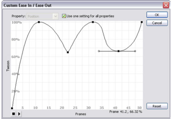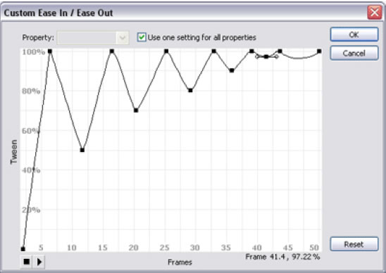 When you click the Edit button next to the Ease slider (you must first click a frame on the Timeline that contains a motion tween), the Custom Ease In/Ease Out dialog box appears with a graph that provides independent control over the symbol properties such as the position, rotation, scale, color, and filters, all of which change during the motion tweening. Note: When you apply custom easing on your symbol, the Ease value in the Property inspector displays --.