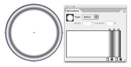 2. Now apply a gradient to the fill of the object. You can do this by clicking on a gradient swatch in the Swatches palette or by creating your own manually in the Gradient palette. Make sure the Type is set to "Radial" in the Gradient palette.