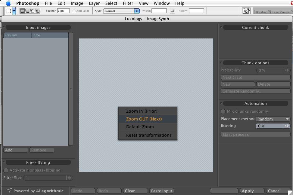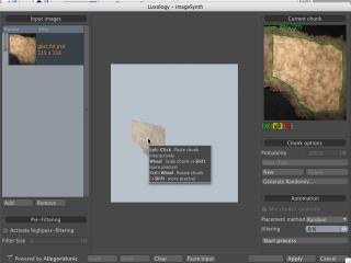 3. Run imageSynth (under Filters). The bigger your tiled image is, the more screen real estate you'll need. In order to zoom out on your texture window, use the CTRL-click contextual menu to allow the texture to fit. (You can use right click)