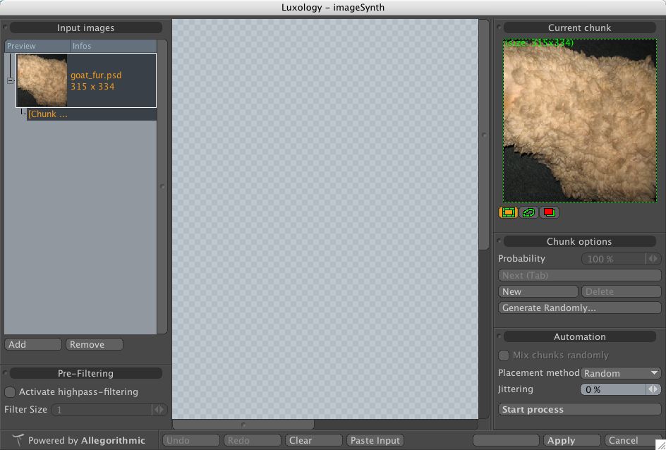 4. Add your input image. (If you notice soon enough, there will be a flashing prompt telling you to start in the left corner). This will create the first input image. It will also assign the first chunk, and show you the current chunk in the preview window.