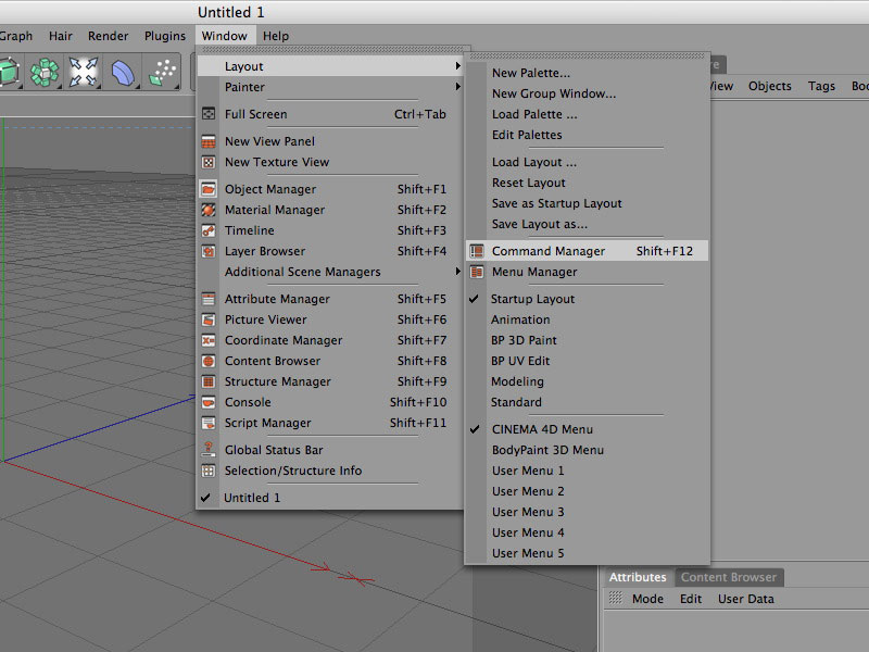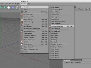 If you're still running a previous version of CINEMA 4D (and at the time of this article, you probably are), you can check out my older article about setting up new commands: More Features, More Shortcuts & Full Screen Mode). MAXON's CINEMA 4D Release 10 makes things a whole lot easier. In previous versions of the software, there was no command for opening up the command manager. Now there is. You'll find the shortcut noted next to the command in the pulldown window: Shift-F12. *(Of course, if you're used to a different short cut for this command, you can always enter the manager and change the stroke for this one as well.)click each image for larger view