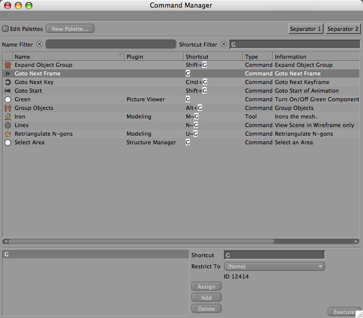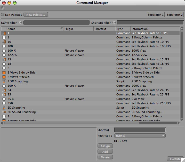 When you invoke the command, you'll get the window for the command manager. This will not only allow you to modify all of the shortcut keys in CINEMA 4D, but you'll be able to change the appearance of your layout as well, by editing the palettes.