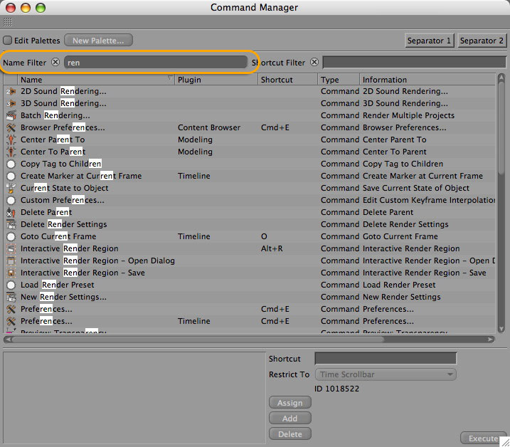 In the name filter dialogue box, typing in a phrase for a common action (like "REN" for all things that contain the phrase "RENDER") will produce a list of command names whose names you may want to modify.